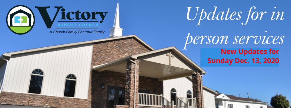 Here is an update on our in person service schedule. As of today, Sunday Dec. 13, 2020, we have returned to in person services here at VBC. Service times will be Sunday morning at 8:30am and 10:30am, Sunday evening at 6pm and Wednesday at 7pm. We will be having Jr. Church during the 10:30am service on Sundays and Kids' Klub on Wednesday evening at 7pm.